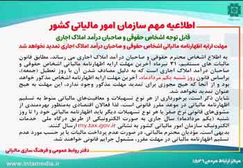 به اطلاع اشخاص محترم حقوقی و صاحبان درآمد املاک اجاری می رساند، مطابق قانون مالیات های مستقیم، ۳۱ تیرماه آخرین مهلت ارایه اظهارنامه مالیاتی اشخاص حقوقی و صاحبان درآمد املاک اجاری است که به دلیل مصادف شدن آن با روز تعطیل (جمعه)، براساس قانون روز شنبه یکم مردادماه، آخرین مهلت ارایه اظهارنامه اشخاص مذکور خواهد بود و از آنجا که هیچ مجوزی برای تمدید مهلت مذکور وجود ندارد، این مهلت به هیچ عنوان تمدید نخواهد شد.