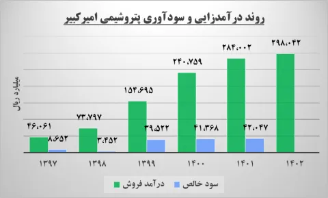 همانطور که در تصویر ذیل مشخص است، درآمدزایی و سودآوری شرکت پتروشیمی امیر کبیر در ادوار گذشته رو به رشد بوده و با توجه به بهبود حاشیه سود شرکت در سال جاری، انتظار می‌رود رقم سود خالص باز هم گام در مسیر صعود بردارد و بیش از ۴۵ هزار میلیارد ریال در صورت‌های مالی رقم بنشیند.