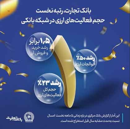 بر اساس گزارش بانک مرکزی‌ جمهوری اسلامی ایران، حجم فعالیت‌های ارزی بانک تجارت در پنج ماهه ابتدایی سال جاری، رتبه نخست را در شبکه بانکی کشور به دست آورد