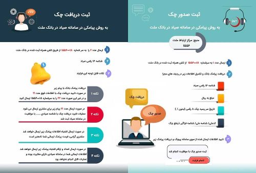 به گزارش روابط عمومی بانک ملت، در این اینفوگرافی، چگونگی ثبت صدور یا دریافت چک های صیادی با استفاده از سرشماره پیامکی ۱۵۵۶۰۰۱۸ به روشی ساده توضیح داده شده است.