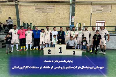 کسب مقام ارزشمند قهرمانی تیم فوتسال صنایع پتروشیمی کرمانشاه در مسابقات فوتسال کارگری استان را به تمامی اعضای تیم، کادر فنی، سرپرستی و مدیریت ورزشی تبریک و تهنیت عرض می‌نمایم.