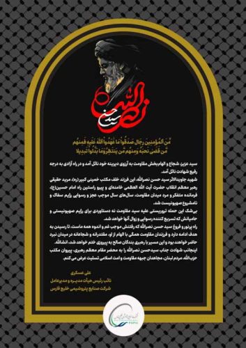 در پی شهادت سید حسن نصرالله، مدیرعامل گروه صنایع پتروشیمی خلیج فارس در پیامی تاکید کرد که راه پرنور و فروغ سید مقاومت به پیروزی ختم خواهد شد و این حمله تروریستی، تسریع کننده زوال عاملان این جنایت است.
